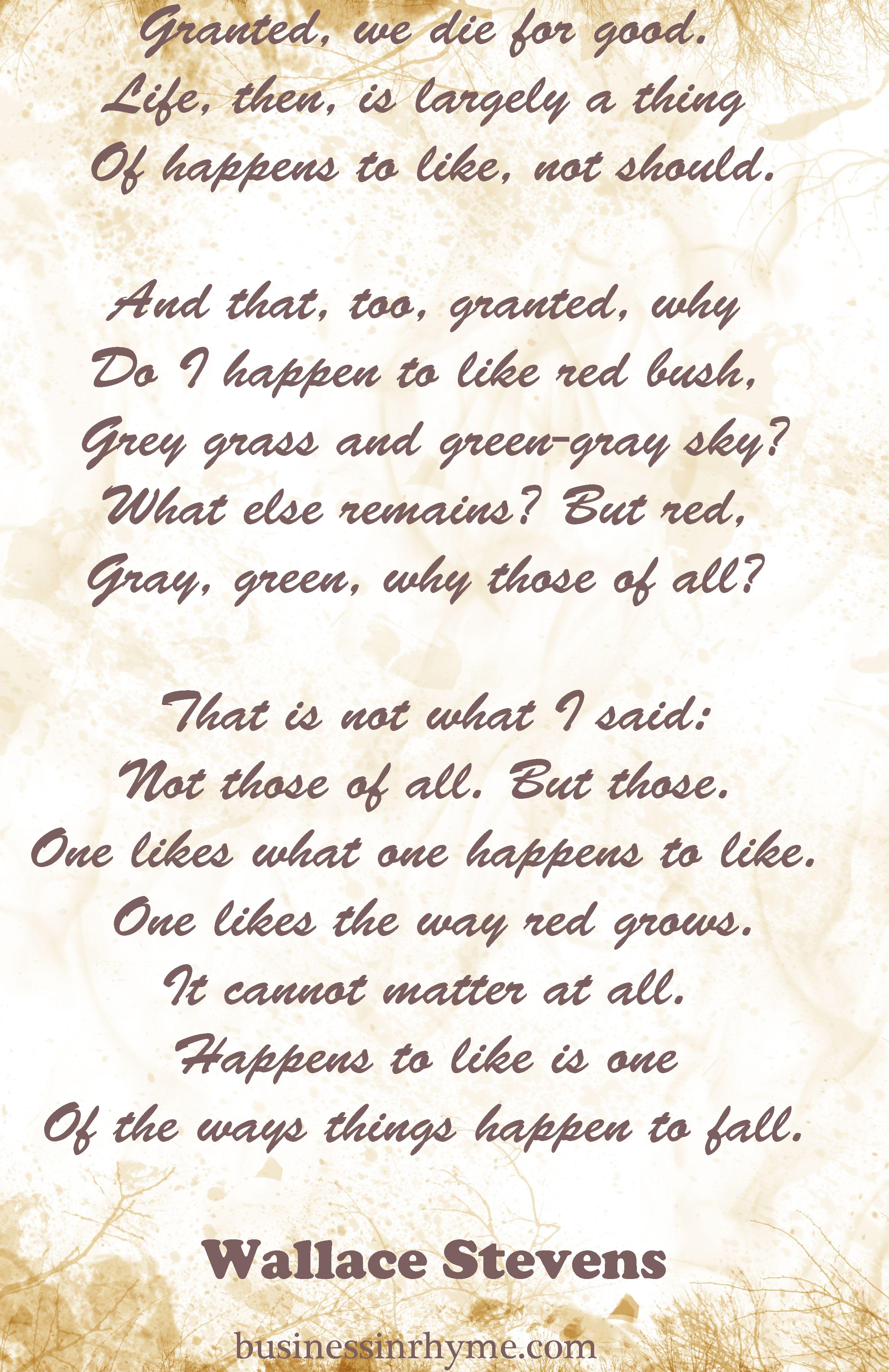 Daily verse with purpose: Wallace Stevens December 20, 2015December 11, 2015 by Maja Todorovic, posted in Daily verse with purpose Share this:Tweet Click to email a link to a friend (Opens in new window) Email Click to print (Opens in new window) Print Click to share on Stumbleupon (Opens in new window) Stumbleupon More Click to share on WhatsApp (Opens in new window) WhatsApp Pocket Click to share on Reddit (Opens in new window) Reddit Like Loading... Related