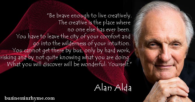 Be brave to life life creatively. The creative is the place where no one else has ever been. You have to leave the city of your comfort and into the wilderness of your intuition. You cannot get there by bus, only by hard work, risking and by quite not knowing what you are doing. What you will discover will be wonderful: Yourself.